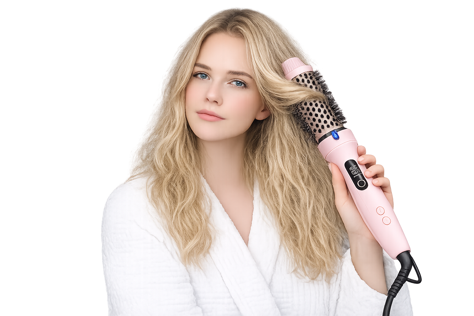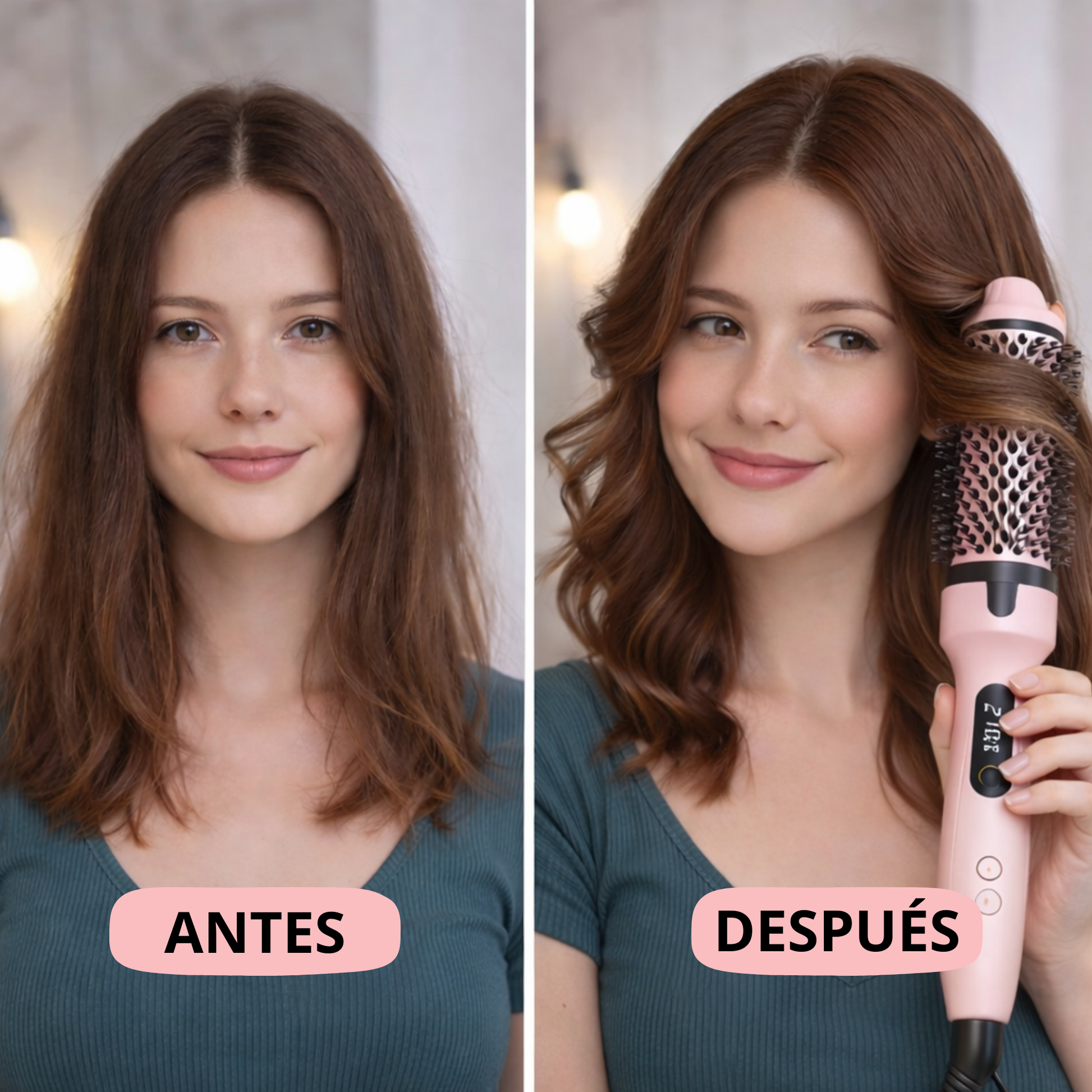 - 🔥 Cepillo térmico + rizador en uno con barril de cerámica turmalina para crear rizos voluminosos, ondas suaves o flequillos con movimiento.